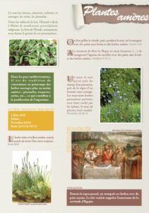 Cette exposition richement illustrée présente une vingtaine de plantes mentionnées dans la Bible, à travers des références multiples. Pour chaque plante est présentée une illustration botanique (planche et/ou photo), les principaux textes bibliques qui l’évoquent et l’utilisation qui en est faite aux temps bibliques. Ainsi, le visiteur s’enrichit à deux titres : en parcourant la Bible et en découvrant les bienfaits que l’on peut retirer de certaines plantes. Une très belle exposition pour s’émerveiller des richesses de la création.