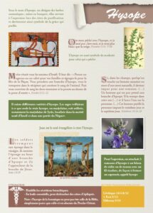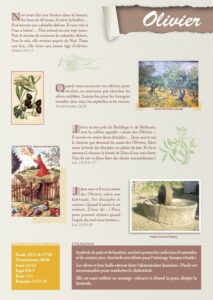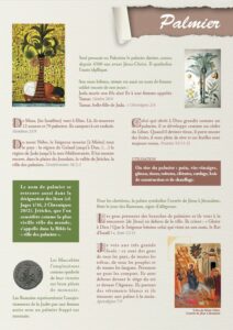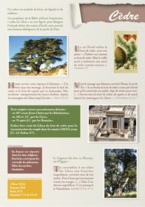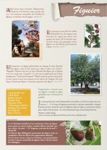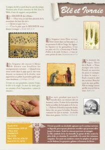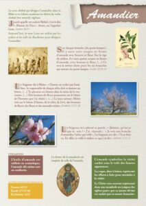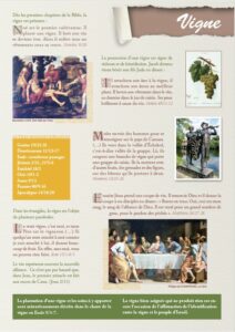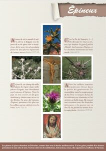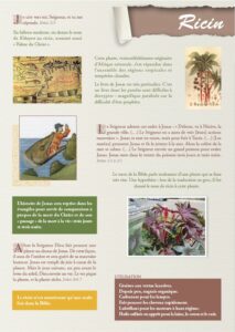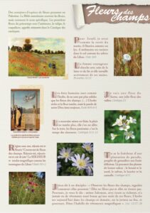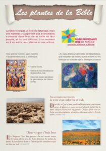 Cette exposition richement illustrée présente une vingtaine de plantes mentionnées dans la Bible, à travers des références multiples. Pour chaque plante est présentée une illustration botanique (planche et/ou photo), les principaux textes bibliques qui l’évoquent et l’utilisation qui en est faite aux temps bibliques. Ainsi, le visiteur s’enrichit à deux titres : en parcourant la Bible et en découvrant les bienfaits que l’on peut retirer de certaines plantes. Une très belle exposition pour s’émerveiller des richesses de la création.